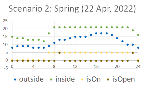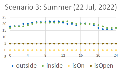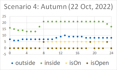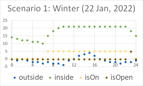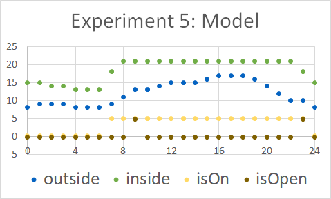 Observation diagrams show the temperatures of the environment and the room together with the opening of the window and whether the radiator is on or off. Check also the complete data sheets.